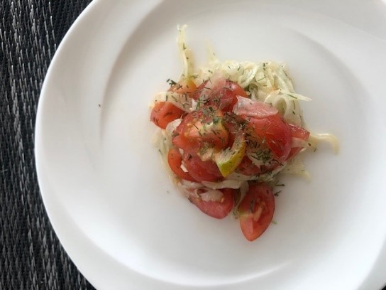Salat anrichten, mit Dill und Fenchelgrün bestreuen.