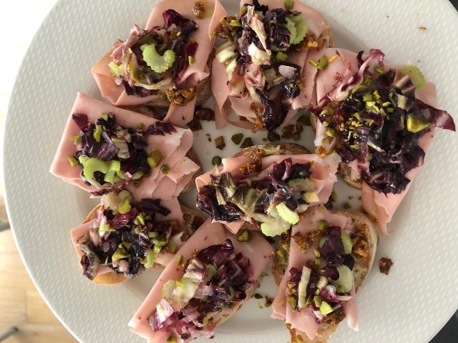 Reihenfolge = (Brot/Butter/Salat/Mortadella/Karamell).