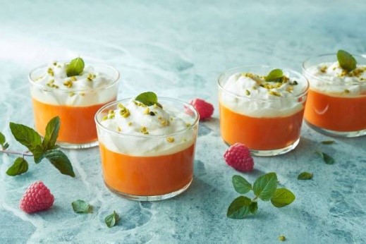 Auf die Karotten-Cotta ganz wenig Honig geben, dann den geschlagenen Rahm, mit Beeren, Pfefferminze und den gehackten Pistazien garnieren.
