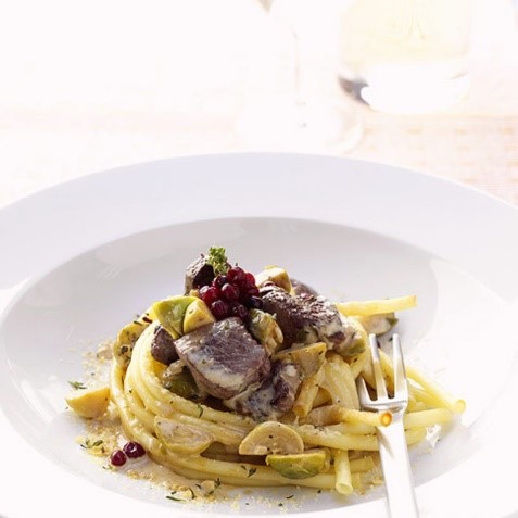 Fleisch mit Sauce über die Pasta geben und mit Preiselbeeren garnieren.