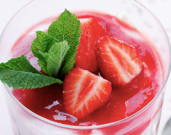 Zum Servieren mit den restlichen Erdbeeren und Minze dekorieren