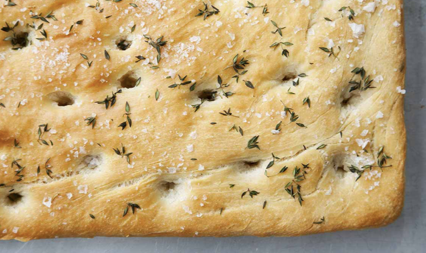 Die Hände nochmals einfetten und mit den Fingerspitzen kleine Vertiefungen in den Teig drücken (ohne Löcher zu machen). Mit grobem Salz und Rosmarin würzen, 10 Minuten in den Ofen geben und dann die Oberfläche mit einer Emulsion aus Wasser und Olivenöl bestreichen. Nochmals 10 Minuten im Ofen backen lassen.