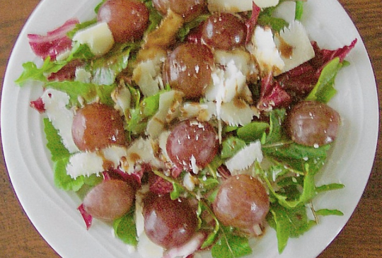 Den gehobelten Parmesan und die Trauben darüber streuen.