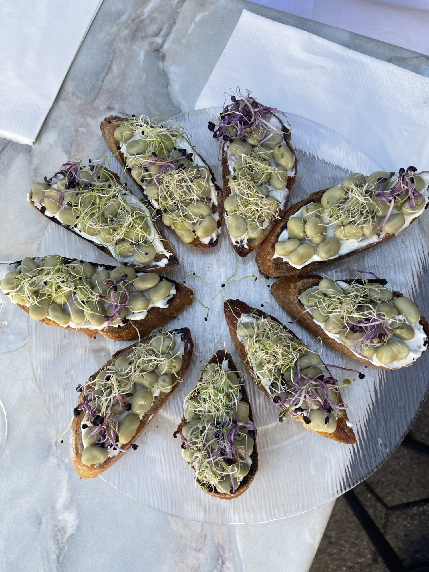 Baguettescheiben in einer Bratpfanne mit wenig Öl rösten. Ricotta mit Zitronensaft und Salz mischen, auf die Crostini verteilen, Micro Greens und Fave-Bohnen darauf anrichten.