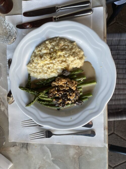 Zwiebel und Knoblauch hacken, und in 2 EL Olivenöl andünsten. Reis beigeben, mitdünsten. Mit Weisswein ablöschen, aufkochen. Nach und nach Bouillon beigeben, leicht al dente kochen (ab 14 Min. Kochzeit Garpunkt laufend kontrollieren). Rahm beigeben, ebenso Parmesan und etwas Butter. Konsistenz auf «a onda» einstellen, mit Pfeffer abschmecken, sofort auf gewärmte Teller anrichten, und mit einem Hauch Zitronenabrieb dekorieren. Spargel dazu anrichten, mit Morchelsauce napieren.