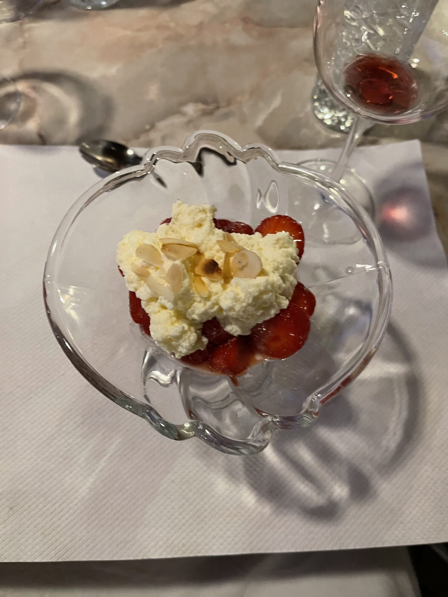 Erdbeeren auf Schalen verteilen, einen Hauch schwarzen Pfeffer aus der Mühle darüber geben. das Schlagrahm-Eierlikörgemisch auf den Beeren verteilen, und mit einem Pfefferminzblatt und den Mandelblättchen dekorieren.