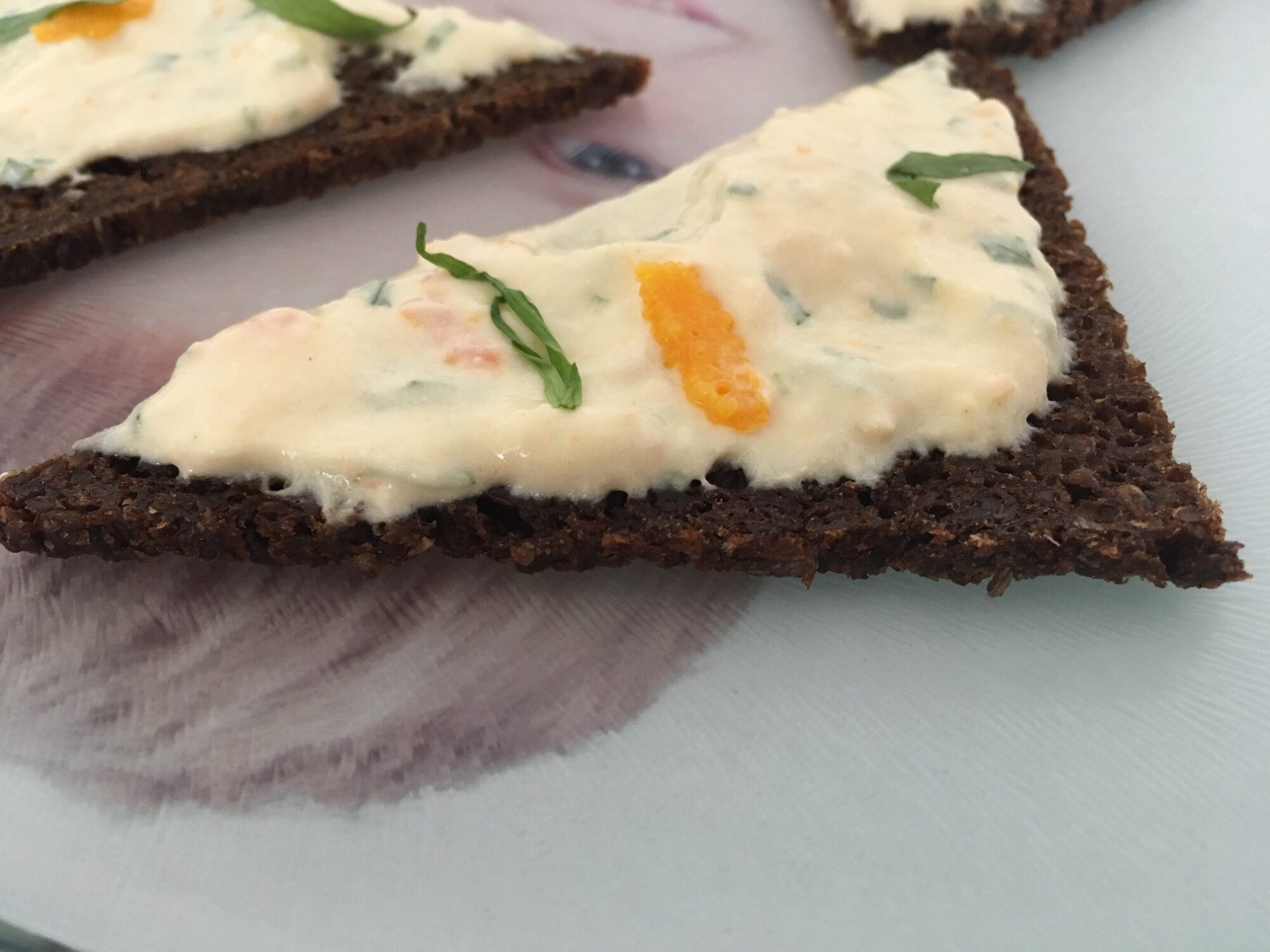 Pumpernickel ohne Fett portionenweise in einer Bratpfanne beidseitig je ca. 1 Min. rösten. Mit Lachsmousse bestreichen, wenig Estragon, Röstzwiebeln und beiseite gestellten Mandarinenzesten garnieren.
