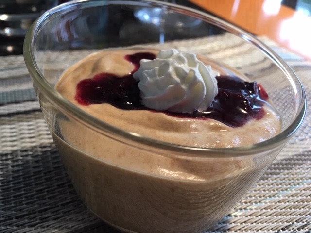 Zum Servieren Rahm steif schlagen. Caramelcrème glatt rühren, Rahm portionsweise unter die Crème mischen. Crème in Gläser verteilen. Etwas Traubenkompott darauf anrichten, Rest dazuservieren.