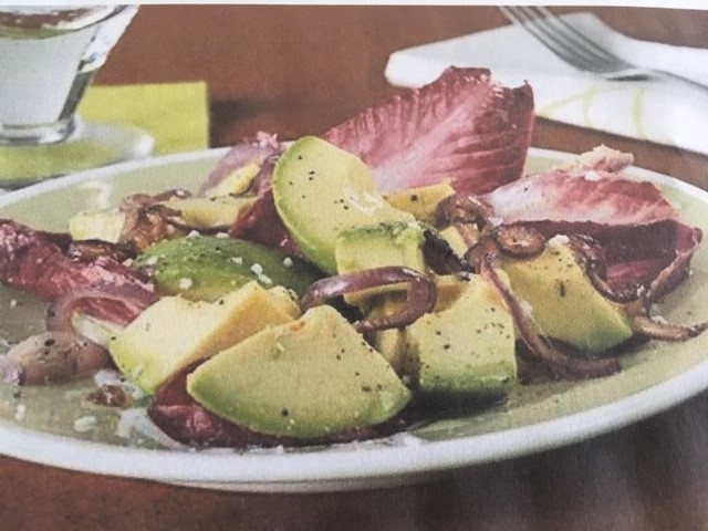 Chicorée putzen und in einzelne Blätter teilen. Mit dem Avocadosalat anrichten. Mit Meersalz und Pfeffer würzen.