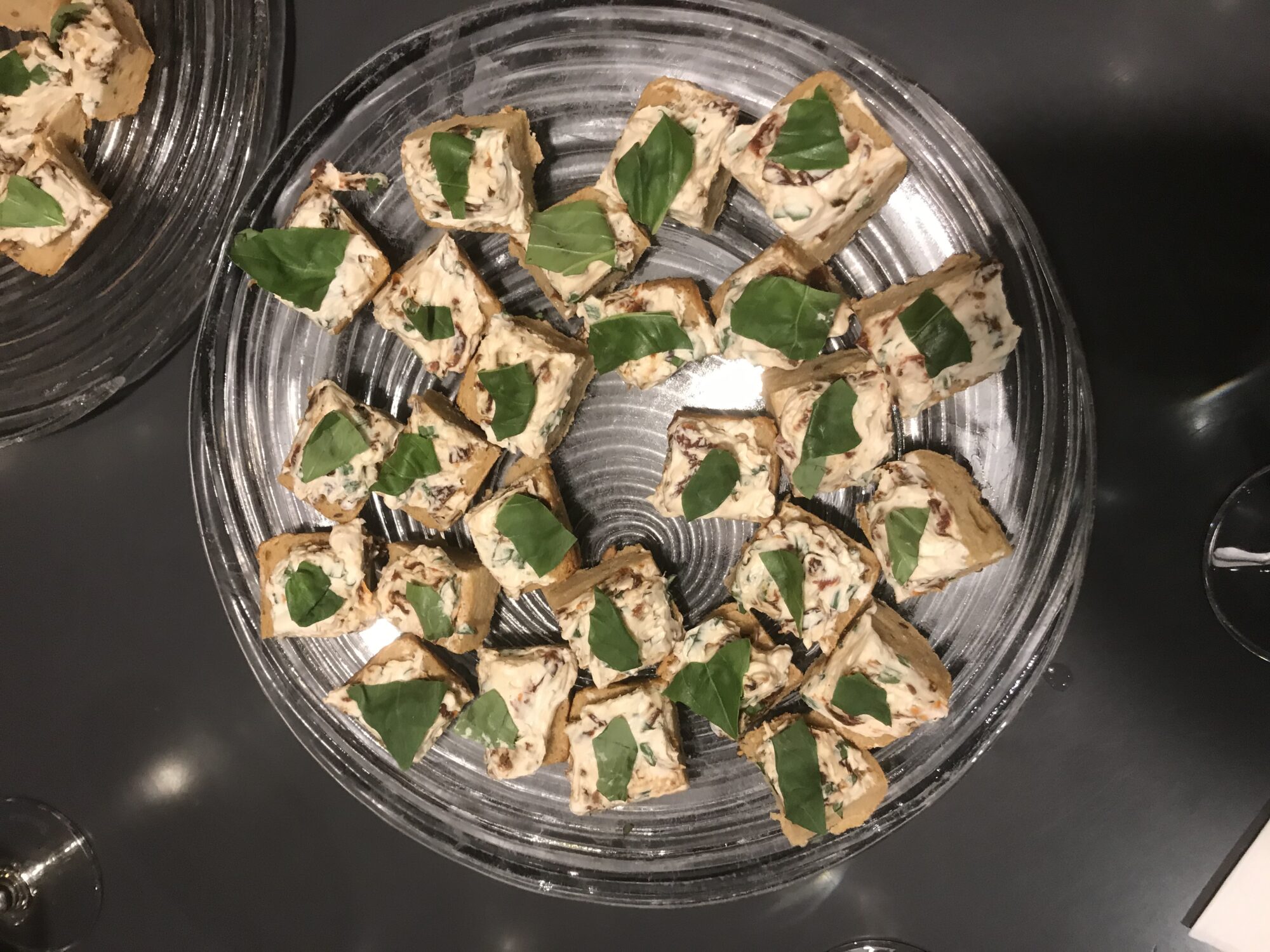 Ciabatte waagrecht halbieren. Brothälften mit Tomatenmousse bestreichen und vierteln. Mit Basilikumblatt verzieren. Auf einer Platte anrichten.